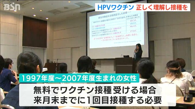シンポジウムでは1997年度から2007年度に生まれた女性が無料でワクチン接種を受ける場合、9月末までに1回目を接種する必要があることなどが説明されました。シンポジウムの模様はYouTubeのBSN公式チャンネルでも配信しています。