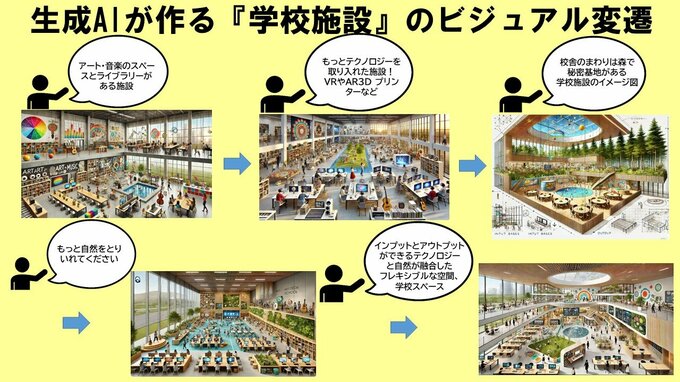 生徒はAIに対し「秘密基地があるイメージで」「テクノロジーと自然が融合したフレキシブルな空間を」などと次々に指示を出して、アイディアを磨いていきます。