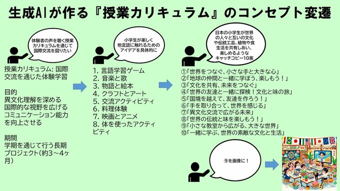 キャッチコピーは『小さな教室から広がる大きな世界』です。目的は異文化を理解・尊重し、国際的な視野を広げるためのコミュニケーションスキルを向上させること。オンラインで交流したり、現地に行って学習したりしたいです。カリキュラム名は、「物語と絵本」「音楽や歌」「クラフトとアート」「植生や農業」など。キャッチコピーもAIに「10個考えて」と指示してその中から選びました。