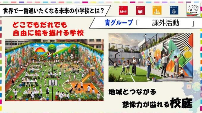生徒たちは「課外活動って何だろう?」と生成AIに聞くところから始めました。スポーツ、ボランティア、絵を描く、などがAIから挙がり、生徒たちからはゴミ拾いや、高齢者と一緒に散歩、などのアイディアが挙がり、「どこでもだれでも自由に画を描ける学校」というコンセプトが固まりました。