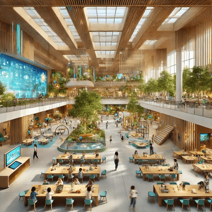 広大なスペースに開放的な建物。窓や天井の開口部は大きく室内にも木が植えられています。内と外と境界はほとんどなく、教室ごとの仕切りや壁が一切無いのも特徴的です。生徒が向かっているのは一人ずつのデスクではなく、共有のテーブル。座って学んでいる人もいれば、ゆったりと歩いている人もいます。そしてその場には外国の人、大人の姿も。AIは生徒たちの言葉をすくい上げ、既成の小学校のイメージを取り払って「ホール」や「ガーデン」といった空間を生み出しました。