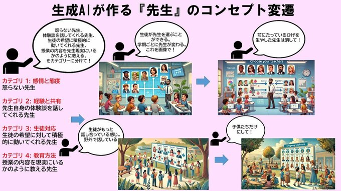 『生徒が先生を選ぶ』『半期ごとに交代』『生徒の希望に積極的に動いてくれる先生がいい』、先生と一緒に過ごす場所は『野外』の方がいいという希望も出て、AIは教壇という一段高いところからでなく、野外のスペースで生徒と語り合う先生の姿を描きました。背景にはまるで選挙のポスターのように「先生選挙」のための顔写真が…。