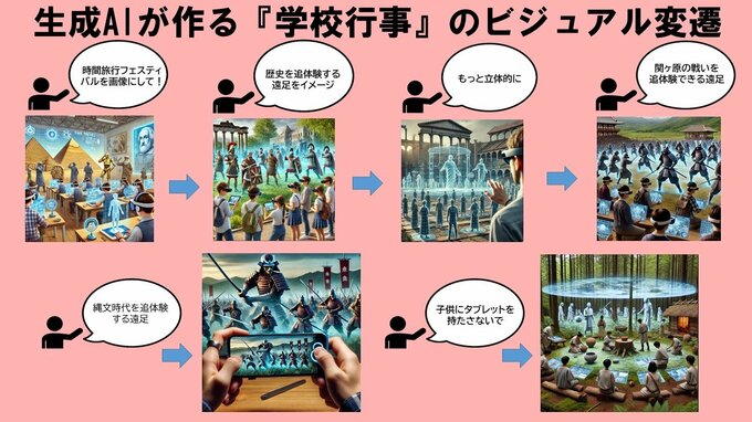 生徒たちは訪問した先で、そこで営まれていた古代の生活や、合戦のようすなどをVR機器なども使いながら追体験する…。AIが描いたのはそんな遠足でした。