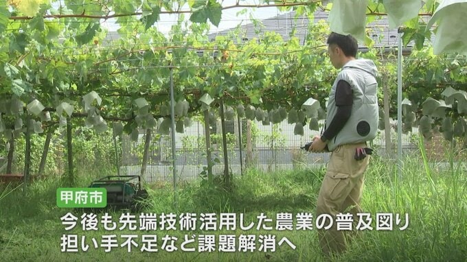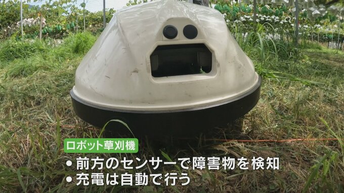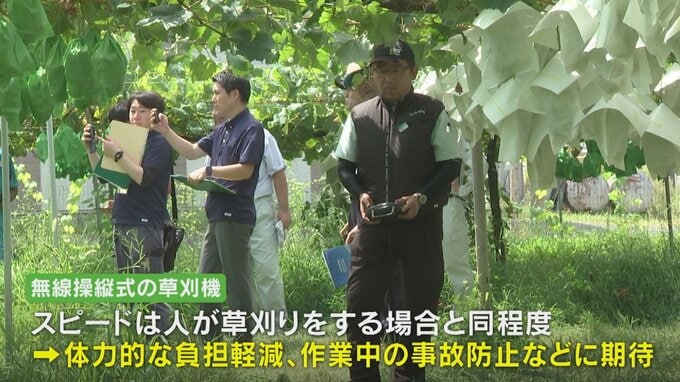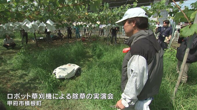 このロボット草刈機などを農業の効率化に役立ててもらおうと、甲府市は19日、甲府市横根町のブドウ畑で周辺の農家を対象とした実演会を行いました。