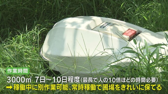 作業時間は3000平方メートルの草刈りで7日から10日程度と、人が行った場合に比べ最長で10倍ほどの時間が必要となりますが、稼働中に別の作業ができることや常に稼働させて圃場をきれいに保てることがメリットとなります。