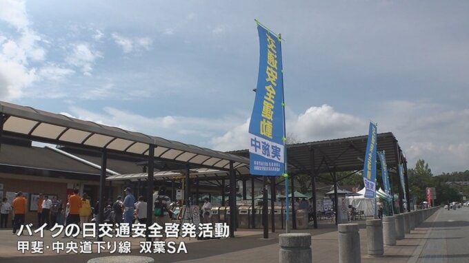 中央道下り線双葉サービスエリアでは山梨県警の高速隊など6つの団体が高速道路で急カーブや衝突事故に注意が必要な場所が書かれたチラシなどを配り、交通安全を呼びかけました。