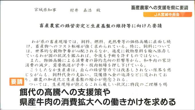 エサ代の高騰や牛肉の価格低迷により、宮城県内の畜産農家は苦しい経営を迫られています。こうしたなか、JA宮城中央会は19日、県に対し迅速な支援を要請しました。