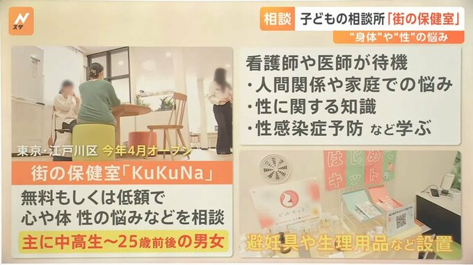 2024年4月にオープンした街の保健室「KuKuNa」では、主に中高生から25歳前後の男女を対象に無料もしくは低額で心や体、性の悩みなどが相談できるそうです。