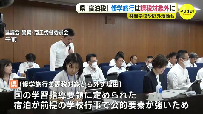 県の担当者は、修学旅行を宿泊税の課税対象から外すことにした理由について、国の学習指導要領に定められた宿泊が前提の学校行事で、公的要素が強いためと説明しました。