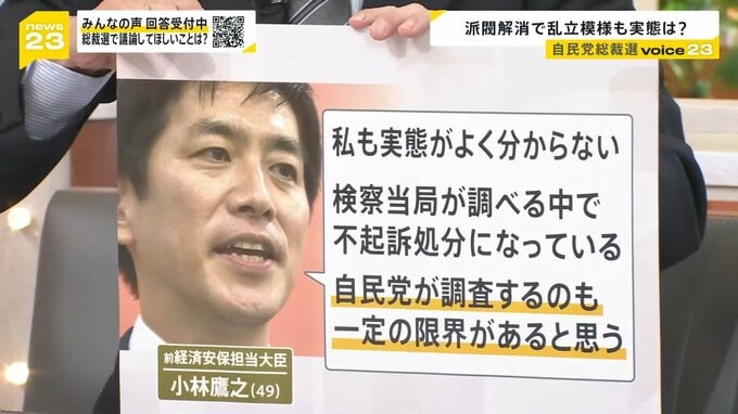 今、お話に出た結党以来最大の危機と、その裏金問題についてこちらをご覧ください。19日の小林さんの出馬会見の中で、裏金問題の実態解明について記者から聞かれました。その答えがこちらです。