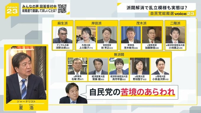 自民党総裁選は、19日に立候補を表明した小林鷹之氏を始め、ご覧の名前が挙がっていて乱立模様となっています。ただ、星さんによりますと、これは自民党の苦境の表れだということですがどういうことでしょうか?