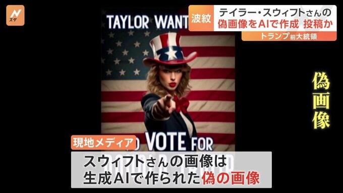 アメリカのトランプ前大統領が人気歌手のテイラー・スウィフトさんが自身を支持しているかのように見える偽の画像をSNSに投稿し、波紋を呼んでいます。トランプ氏はSNSで「テイラーは、あなたにトランプ氏への投票…