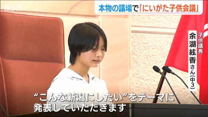 【子供議長 余湖絃香(よご いとか)さん(中三)】「ただいまからこども会議を開会いたします。本日は新潟県の子どもの代表として、”こんな新潟にしたい”をテーマに発表していただきます」