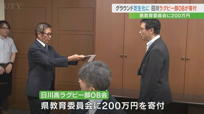 県立日川高校のグラウンドの人工芝化に役立ててもらおうとラグビー部のOB会が山梨県に200万円を寄付しました。