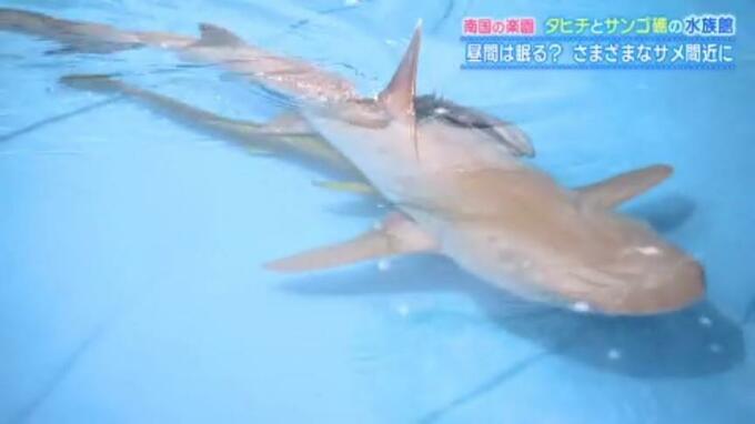 愛媛県松山市のいよてつ高島屋で開かれている夏のスペシャル水族館、その見どころのひとつは、さまざま種類のサメを見ることのできる水槽です。大きな水槽の中をゆうゆうと泳ぐのは…「ネムリブカ」に「ドチザ…