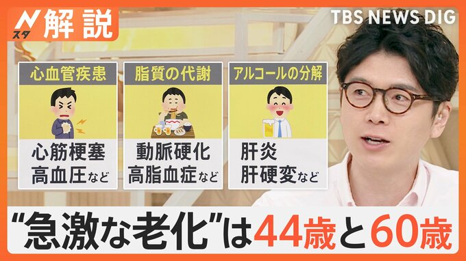 『老化』と聞けばゆっくり進むと思われますが実はアメリカの大学が発表した研究結果では44歳と60歳前後の2回のタイミングで急激に進むことが分かりました!良原安美キャスター:アメリカのスタンフォード大学が44歳…