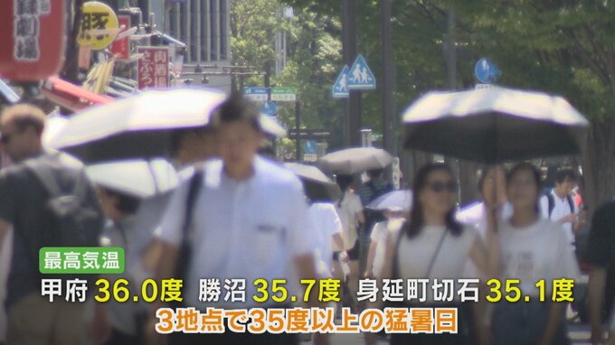 最高気温は甲府が36度、勝沼が35.7度、身延町切石が35.1度などとなり、観測10地点のうち3地点で35度以上の猛暑日となりました。