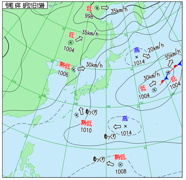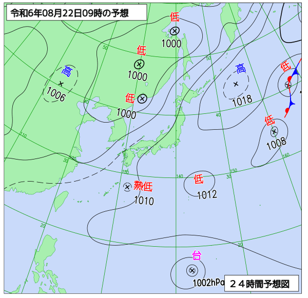 22日15時時点で、中心気圧1002hPa、中心付近の最大風速は18m/sと予報されています。