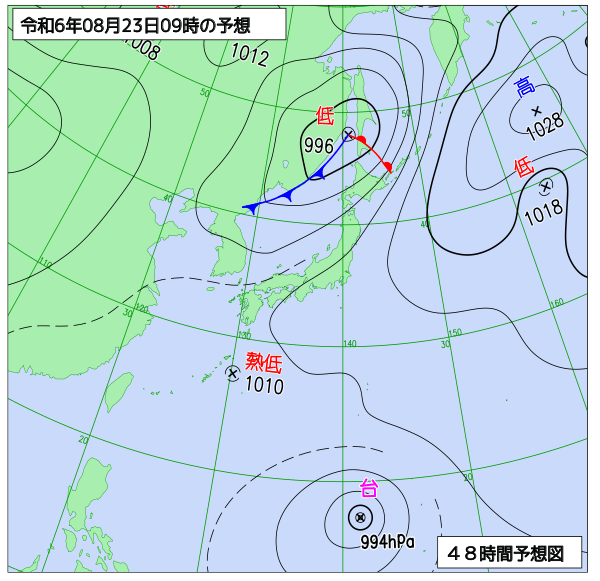 23日には中心気圧994hPa、中心付近の最大風速23m/s、
