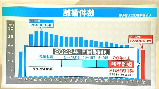 そして次いで多いのが、同居期間が20年以上の“熟年離婚”で約4万件。これは1998年以降、高止まりしているんです。