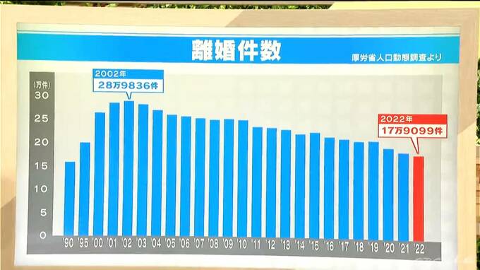 離婚件数は2002年がピークで29万件ほどでした。そこから見ると減少傾向ではあり、最新の2022年で18万件ほどです。