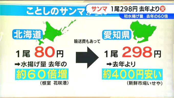 去年の初水揚げは0.5トンだったんですが、ことしは30トンと大幅に増加。一尾の値段は北海道、地元の根室では1尾80円。水揚げ量が増えたことで値段は抑えられたということです。愛知県ではどうかというと…1尾298円なので、3倍以上となっています。