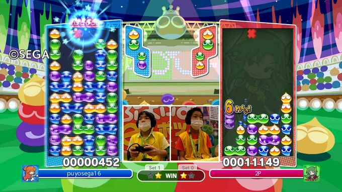 「ぷよぷよ」は、画面上から落下するスライムタイプのモンスター「ぷよ」を操作し、同じ色が4個以上くっつくと消滅し、得点となります。連鎖を起こし、次々に「ぷよ」が消滅すれば、それだけ相手に大きな負荷を与えることができます。