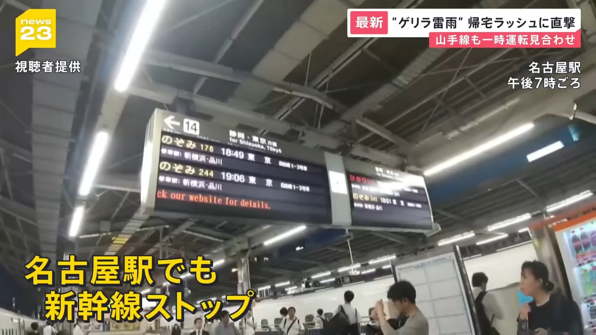 また、東海道新幹線も雨量計の数値が規制値に達したため、午後6時38分から東京駅と新横浜駅の間の上下線で運転を見合わせました。その後、午後7時半ごろに運転を再開しましたが、この影響で関東から離れた名古屋駅でも新幹線がストップ。