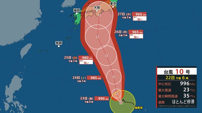 台風10号は、太平洋高気圧の西への張り出しが強ければ西日本に、弱ければ東日本に到達し、直撃する可能性もあります。