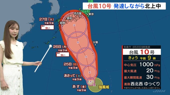 けさ、南の海上で台風10号が発生しました。今後は発達しながら北上して、月曜日から火曜日にかけては強い勢力となって西日本や東日本に近づくおそれがあります。来週は西日本や東日本の太平洋側で大雨のおそれがあります。