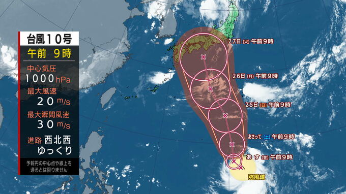 台風10号は、22日午前9時現在マリアナ諸島にあって、ゆっくりと西北西に進んでいます。中心気圧は1000ヘクトパスカル、中心付近の最大風速は20メートルです。