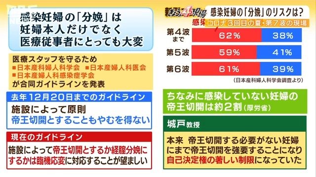 もちろん、お母さんと子どもの命、出産を守るために帝王切開が医学的に選択される場合は選択されて、従来なら2割程度が行われてるということです。これに対して、コロナ感染が起きると、自然分娩をすると時間がかかりますから、そうすると周りのスタッフも皆、感染の恐れが高くなるわけです。それが理由で、ひとたび院内で感染が起こってしまえば、以降の分娩なりが大きく障害を受けるので、これまで産科病棟というか、クリニックは、コロナに感染してしまった妊婦さんの自然分娩を長時間扱うことをやはり恐れてたんです。それで苦渋の決断として、帝王切開を選択せざるを得なかったというのがあったのでは、という側面があります。