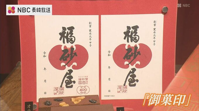神社や寺院の「御朱印」にならってオリジナルの「御菓印」を配布する取り組みが、長崎市の福砂屋本店で始まっています。カステラの老舗「福砂屋」本店だけで受け取れる「御朱印」ならぬ「御菓印」、中央には商標の…