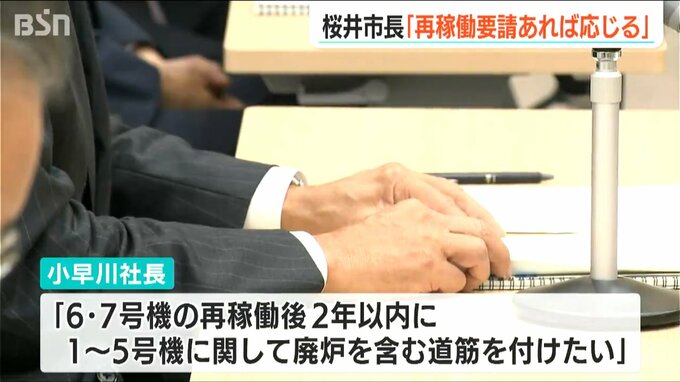 小早川社長はこう述べた上で、「6・7号機の再稼働後2年以内に1~5号機に関して廃炉を含む道筋をつけたい」と話しました。