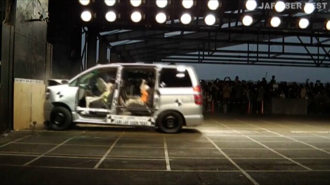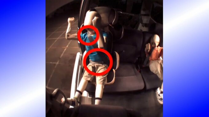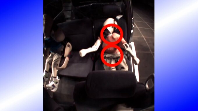事故を起こした時、子供にシートベルトがどう作用しているのかの実験映像です。6歳児に見立てた人形2体を後部座席に座らせました。片方は学童用のジュニアシートを使ったうえでシートベルトを着用。もう片方はジュニアシートを使用せずにシートベルトを着用させます。