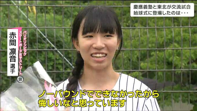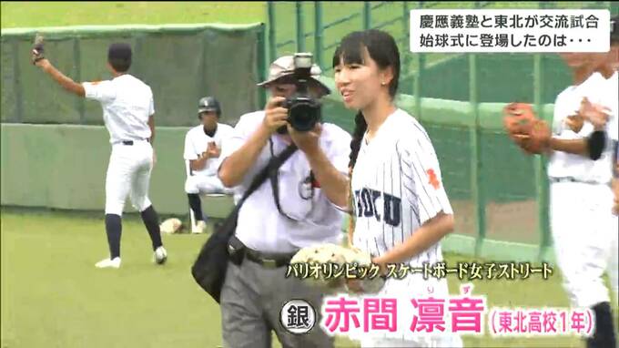 東北福祉大学野球場で行なわれた東北と慶應義塾の交流試合。始球式に現れたのは…。パリオリンピック™スケートボード競技で銀メダルを獲得した東北高校1年の赤間凛音選手です。