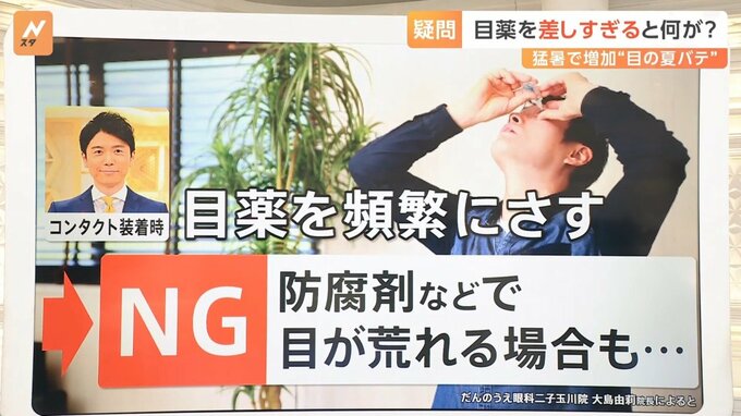 あとは、コンタクト装着時に目薬を頻繁にさすことがあるかもしれませんが、防腐剤などで目が荒れる場合もあるので、頻繁にさすのはNGだということです。