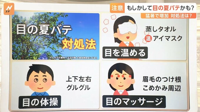 対処法は、▼蒸しタオルや温かいアイマスクで目を温める、▼眉毛のつけ根やこめかみ周辺で目のマッサージをする、▼上下左右、目をぐるぐるして目の体操をするといいそうです。