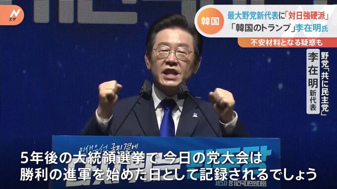 韓国の国会で過半数の議席を握る野党は、「対日強硬派」としても知られる元大統領候補の李在明氏を党代表に選出しました。野党「共に民主党」 李在明 新代表「足を引っ張るのではなく、巧みな競争で国民の希望に…