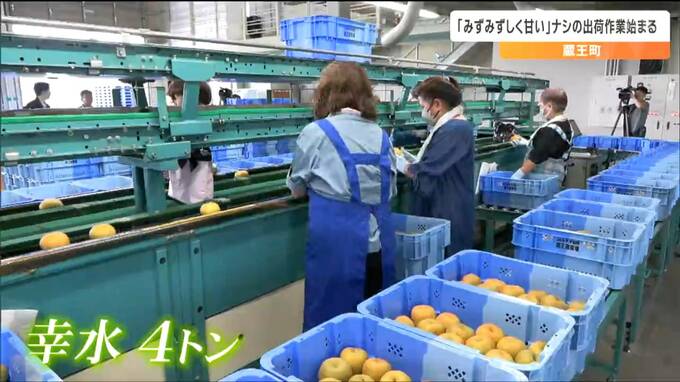蔵王町梨選果場で行われた安全祈願祭には、農家やJAの関係者らおよそ50人が出席しました。23日朝早くから選果場には「幸水」およそ4トンが運び込まれ、糖度などを測定する光センサーを通したのち大きさで選別しながら箱詰めしていきました。