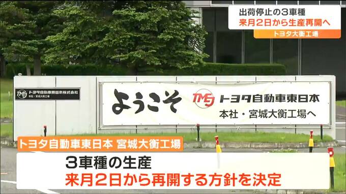 トヨタ自動車の認証不正問題で出荷が停止していた3車種について、宮城県大衡村にある子会社の工場では9月2日から生産を再開する方針を決めました。