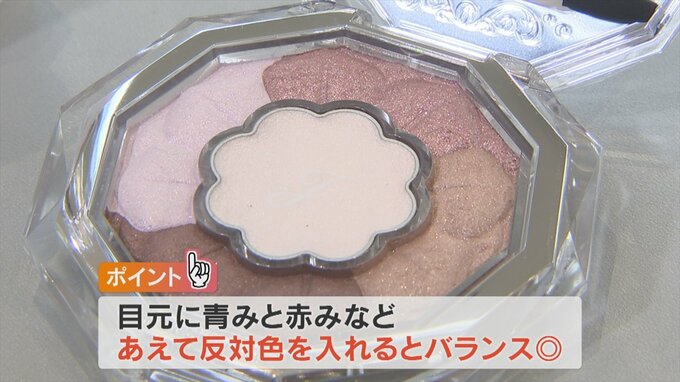 目元にあえて反対色の青みと赤みを使うことでバランスが良くなるそうです。