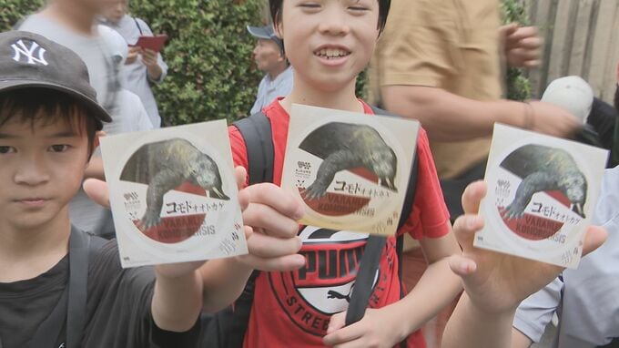 一目散に走り出した子どもたち。23日は、開園30分限定で「タロウ」公開の記念ステッカーも配られました。