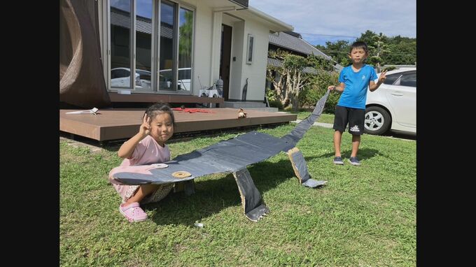 この夏休みの自由研究は、「タロウ」の実寸大模型を段ボールで作っている最中。