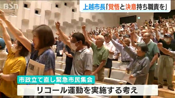22日夜には一部の市議や市民有志が集会を開き、早期の辞職を求めた上で解職を求める「リコール運動」を実施する姿勢を示していました。