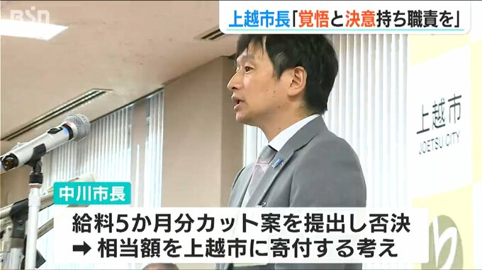 中川市長は給料5か月分をカットする案を市議会に提出し、否決されていましたが、市長をやめた後にそれに相当する額を上越市に寄付する考えです。