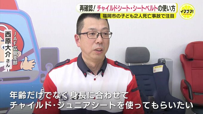 特に子どもの場合、衝突時にシートベルトが首や腹部を圧迫する恐れもあるということで、JAFの西村さんは「構造上、シートベルトは鎖骨や腰骨で支える設計になっているので、小さい子どもは『チャイルドシート』や『ジュニアシート』で高さを調整して正しい位置に取り付けてもらいたい」と訴えます。