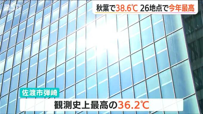 佐渡市弾崎では観測史上最高となる36.2℃を記録したほか、新潟県内の最高気温は、新潟市秋葉区で38.6℃・三条市で37.2℃・長岡市で37.1℃・新潟市西蒲区では36.9℃など、県内に28か所ある観測地点のうち、26か所で今年最高となりました。