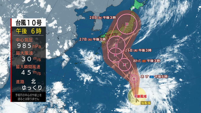 台風10号はこれまでの予想より東よりに進む予想になっていますが、発達しながら日本に近づき、24日(土)には最大風速が35メートルと「強い」勢力になる予想です。その後26日(月)には最大風速が45メートルと「非常に強い」勢力になりそうです。