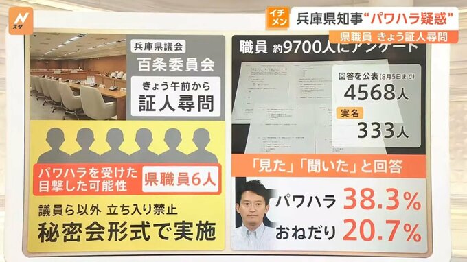 斎藤知事からパワハラを受けた、また目撃した可能性のある県職員6人が、議員ら以外は立ち入り禁止で、秘密会形式で実施されています。
